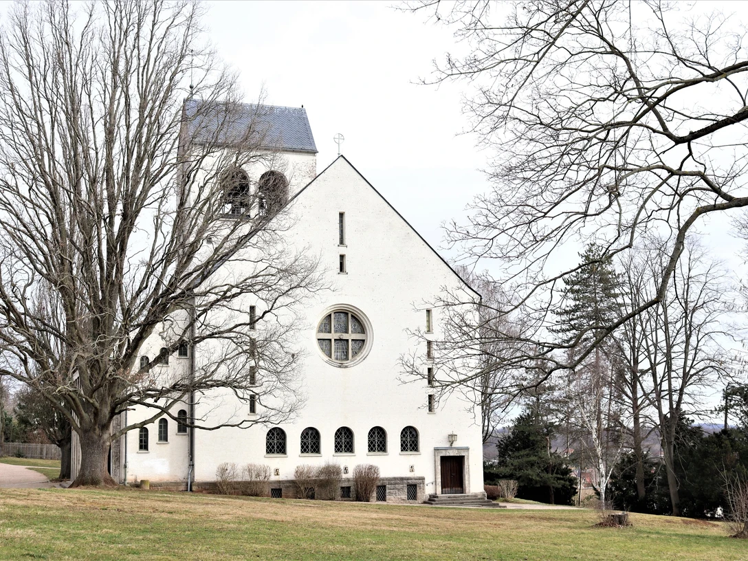 Die Bauleitung lag in den Händen des Dresdener Architekten Prof. Oswin Hempel. Sehenswert sind im Altarraum die Fresken von Prof. Rößler, eine große Kreuzigungsszene in der Mitte sowie links beim Taufbecken die Darstellung der Taufe Jesu. Bemerkenswert ist das in rotem Mainsandstein gestaltete Relief zum Abendmahl am Altar sowie das Relief „Spinner“ als Stützfigur für die Kanzel, beides Arbeiten des Dresdener Bildhauers Dämmig. Ebenso interessant ist schließlich die Darstellung einer Engelgruppe am Haupteingang, geschaffen vom Dresdener Professor Nadler.
